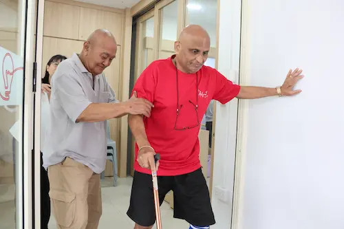Caption: Mr Yacob (left) helping Mr Sasi who has mobility issues