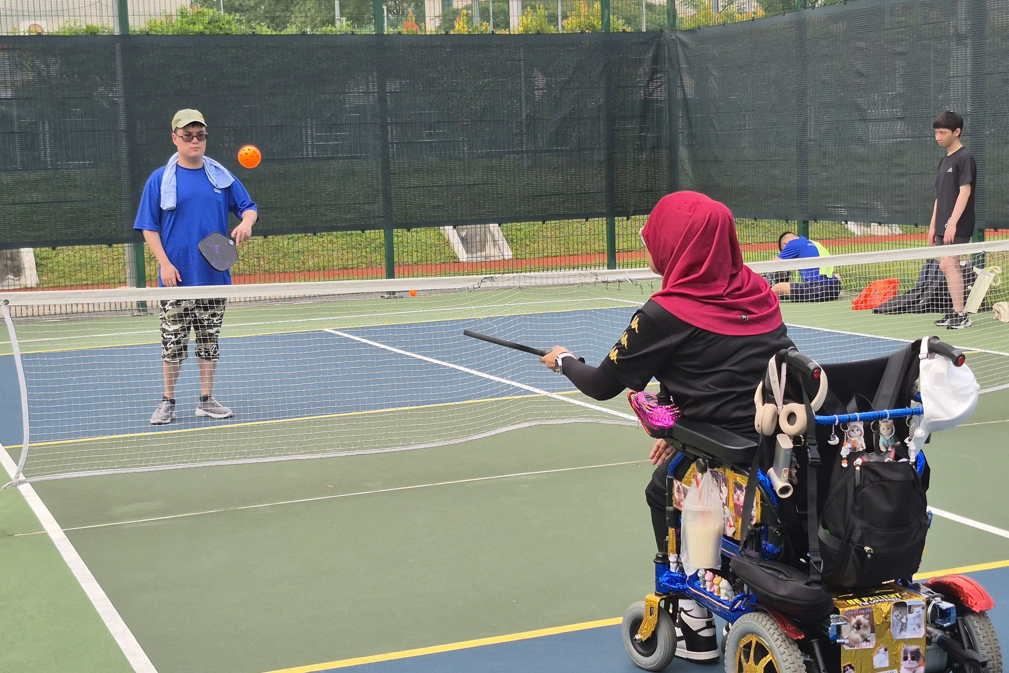 Caption: Tek Poh enjoying a game of pickleball together with a friend from ESH@Jurong.