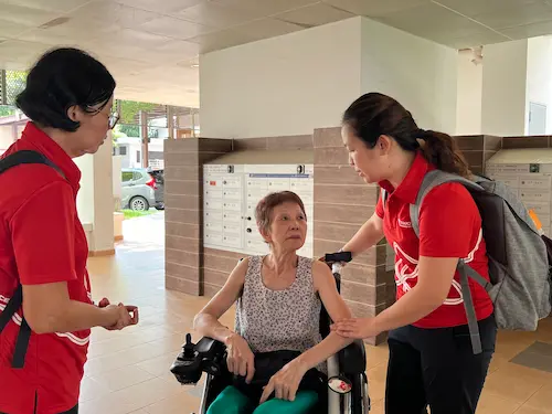 Caption: The Reablement team advising and encouraging Mdm Yeo